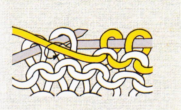 Virbalas keliamas j viršų ir, sukant į dešinę pusę, užkabinamas mezgimo siūlas. Siūlu apsuktas virbalas leidžiamas žemyn ir perveriamas per akį. Akis nuleidžiama.